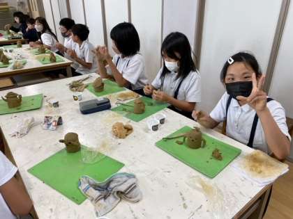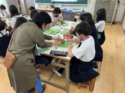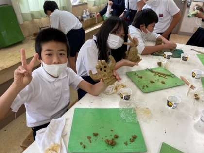 子どもたちが、一生けんめいに粘土を組み立てながら、はにわをつくっています。
