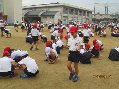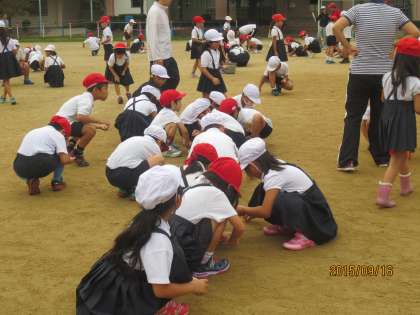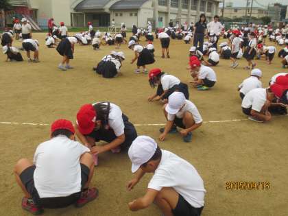 1年生から6年生の375名が、一生懸命に石拾いをしたので、たくさんの小石がバケツに集められました。