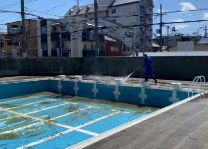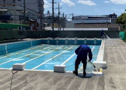 19日から始まる「水泳の学習」に備え、業者によるプール清掃を行いました。