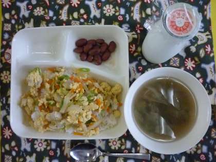 親子丼、すまし汁、金時豆の煮もの、牛乳