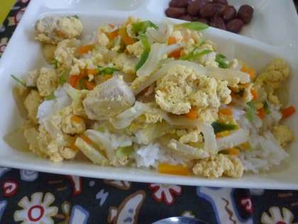 鶏肉と鶏卵を主材にした丼です。卵除去献立です。