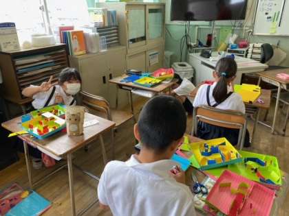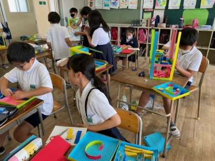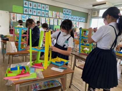 1組の図画工作科は、子どもたちが5月から作っていた「コロコロガーレ(ビー玉が転がるしくみを利用して作るカラフルで大きな立体迷路)」がいよいよ完成です。