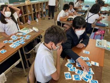 スポーツの名を書いたカードをもとに、子どもたちと先生が会話をしていました。