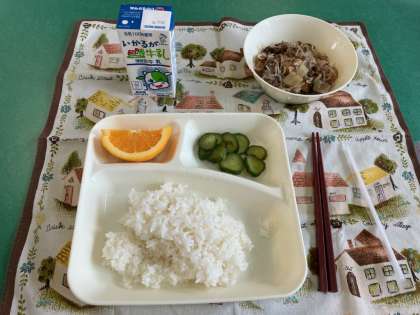 すき焼き煮、きゅうりのしょうがづけ、オレンジ、ごはん、牛乳