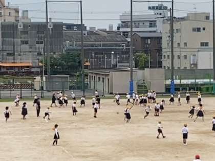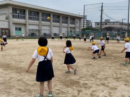 どんよりとした空ですが、運動場では子どもたちが元気に遊んでいます。