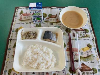 さごしのつけ焼き、みそ汁、キャベツの赤じそあえ、ごはん、牛乳