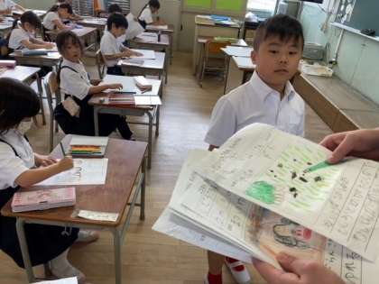 子どもたちが、今日の「公園たんけん」をふり返り、絵と感想を書きました。