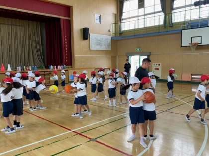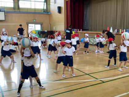 講師の方の指示で、リズムに合わせて体を動かしたり、ボールを使った運動をしました。