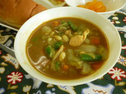 鶏肉を主材に鉄分の多いてぼ豆の入ったカレー煮です。米粉のカレールウを使っています。
