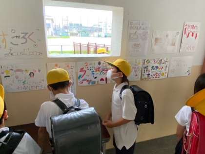 登校してきた子どもたちが、興味深く見ています。
