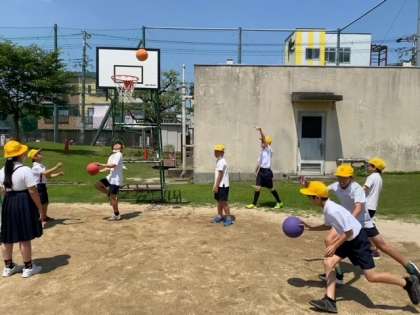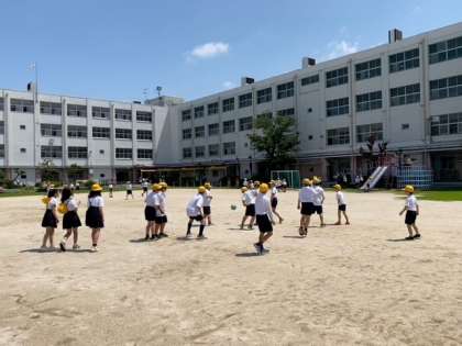 運動場では、子どもたちが、鬼ごっこをして走り回ったり、ボールで遊んだりしていました。