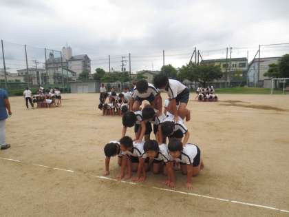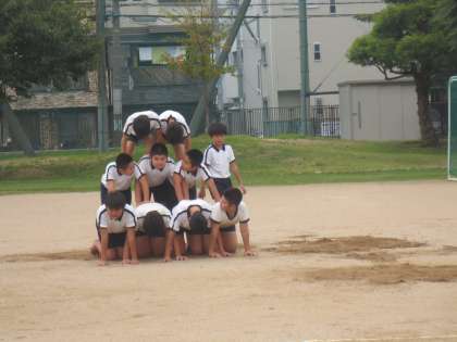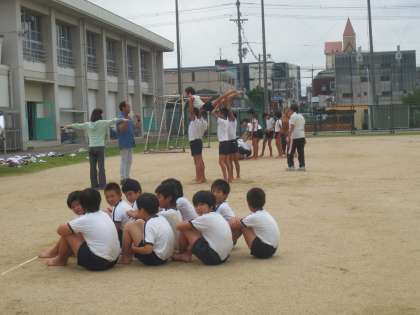 連休前から体育館で基本の動きを何度も繰り返していました。今日ようやく雨が上がり、やっと運動場で練習ができました。自信をもってよい動きができていました。