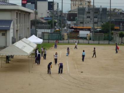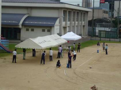 雨の日が続きましたが、午後から運動場も使用できるようになりました。10月4日の運動会に向けて、来週1週間は、今までの練習の総仕上げです。運動場にセパレートラインも引きました。本部席等のテントも設置しました。だんだん運動場に向けって気持ちも高まってきます。10月29日、30日には、開会式、閉会式など児童全員による運動会全体練習が始まります。今日の放課後、そのための準備を職員で実施しました。