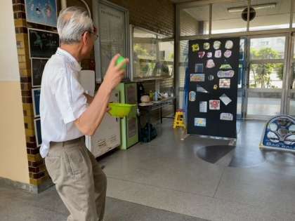 「校長先生もどうぞ」と声をかけていただき挑戦しました。 見事、穴にボールが入りました。(笑)