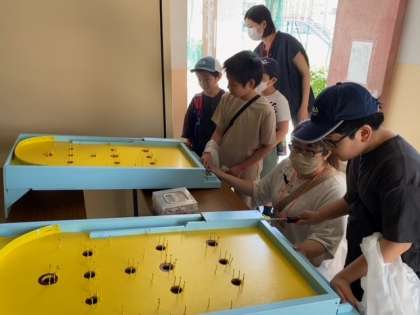 子どもたちが、「コイン落とし」と「スマートボール」にチャレンジしています。