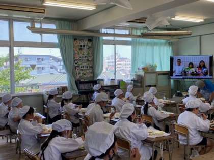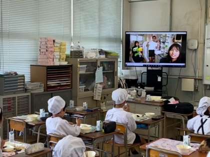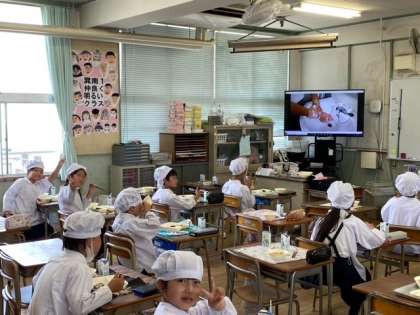 給食の時間に、健康委員会の児童がつくった「手洗い」のビデオが各学級で流れました。