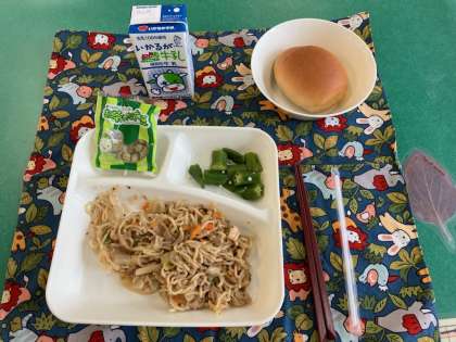和風焼きそば、オクラの甘酢あえ、まっ茶大豆、黒糖パン1/2、牛乳