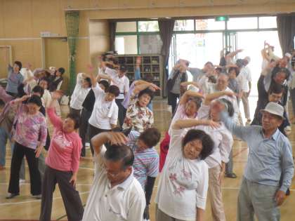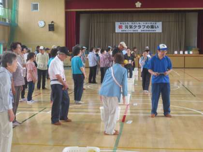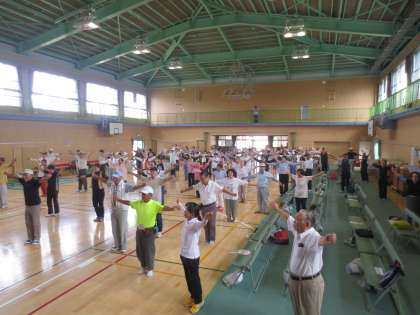 全員で準備運動のラジオ体操をしています。とても動きがよくお元気です。いよいよスリーアイズの競技開始です。