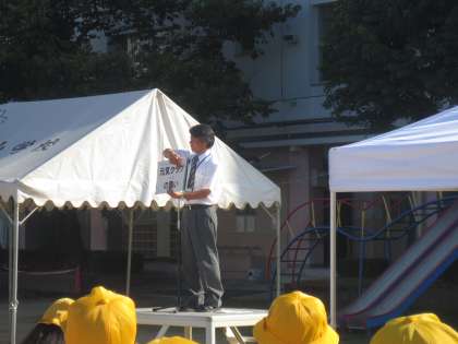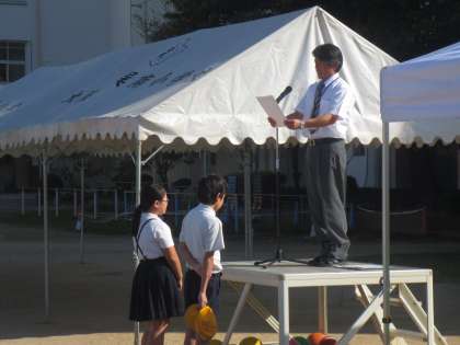 最後に、運動会の『応援団』のお話をしました。とても意欲的に応援練習をしています。この応援団のリードで、紅白それぞれが大きな声で応援をすることで、運動会が盛り上がり、各競技に出場している友だちがより全力で頑張るようになります。みんなの声が響きわたる応援を期待しています。
