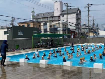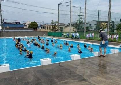 子どもたちが、先生の指示に従って入水し、水中で体を動かしました。