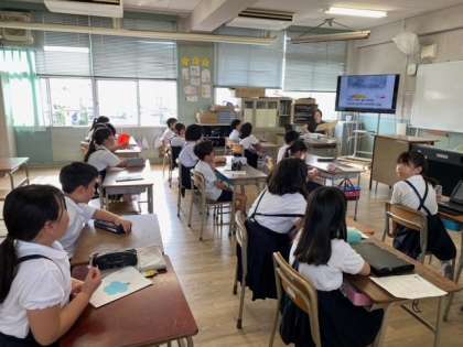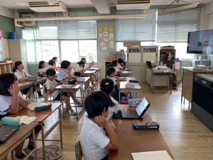 3年生の教室でも、子どもたちが、先生と一緒に画面を見ながら英語に親しんでいました。