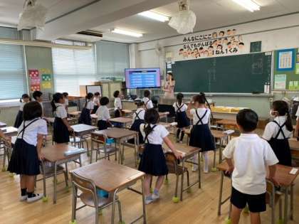 今日はイングリッシュタイムの曜日なので、先生との朝のあいさつも英語でしていました。