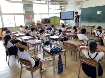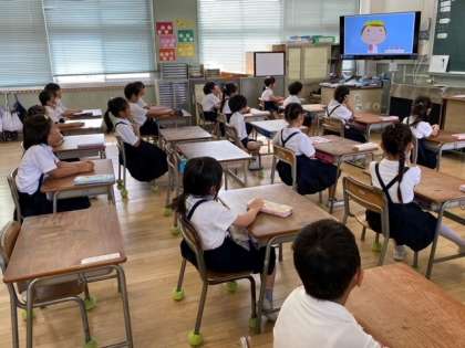 大型テレビの映像を見て、子どもたちが、一緒に発音したり、体を動かしたりして楽しんでいました。