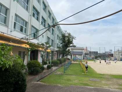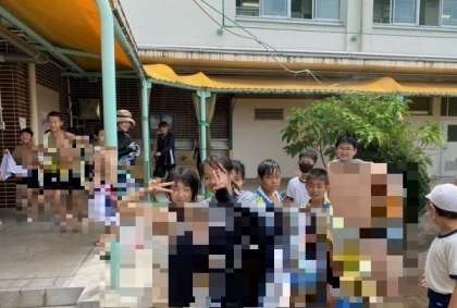 水泳学習が終わって教室へ帰る6年生も 笑顔で涼んでいました。