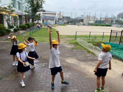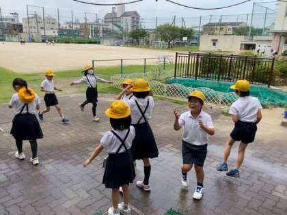 3・4年生の子どもたちが、シャワーの下ではしゃいでいます。