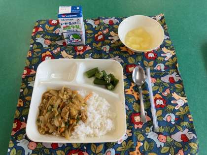 和風カレー丼、オクラのかつお梅風味、りんご(カット缶)、ごはん、牛乳