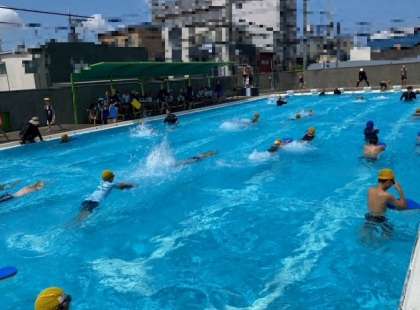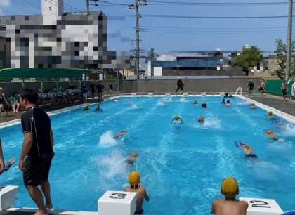 自信を持って泳ぐ児童、ビート板を使う児童、それぞれ自分にあった泳ぎ方で25メートルに挑戦していました。