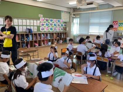 1組の国語科では、子どもたちが、グループに分かれて「おおきなかぶ」を音読しました。
