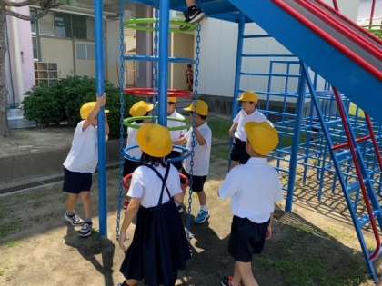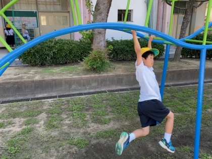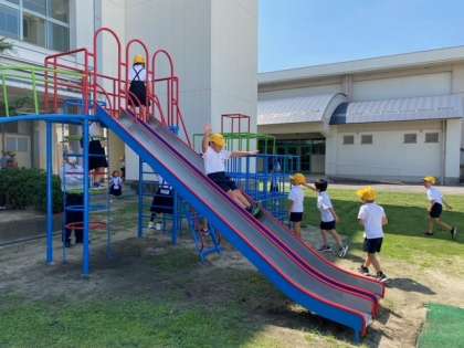 昨日、塗装と修理が終わり、きれいになった「遊具」で子どもたちが、思い切り遊んでいました。