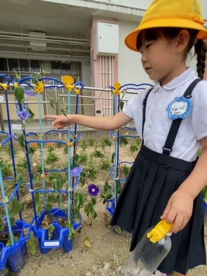 「ほら、咲いたよ」と、児童が「アサガオのお花」を見せてくれました。
