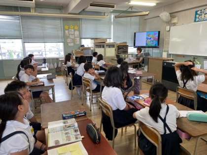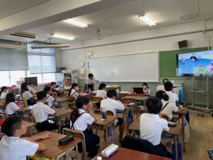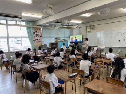 子どもたちが、大型テレビの映像を見ながら、「英語」に親しんでいました。