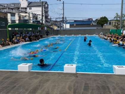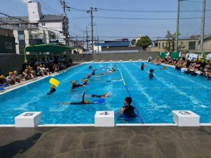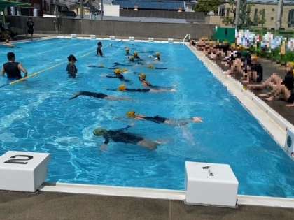 5年生の児童はクロールの手の動きを、6年生の児童は平泳ぎの手足の動きを練習していました。