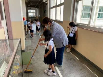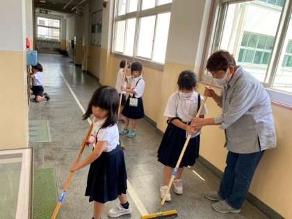 4名の方々が、1年生の子どもたちと一緒におそうじをしてくれています。