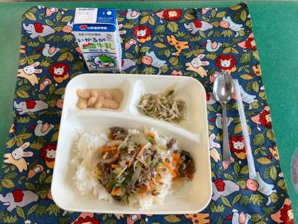 牛丼、もやしとピーマンのごまいため、大福豆の煮もの、牛乳