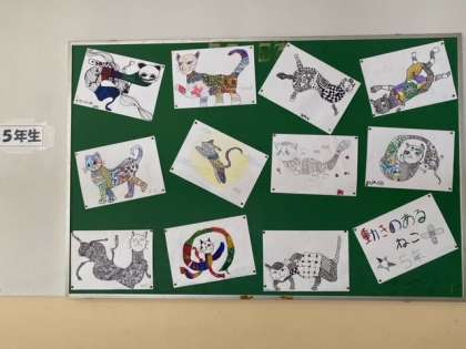 5年生と3年生の学年掲示板に、「動きのあるねこ」(5年生作品)と、習字「下」「日」(3年生作品)が、それぞれ掲示されています。