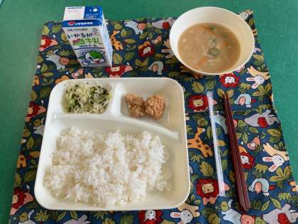 豚肉のたつあげ、みそ汁、切干だいこんのゆずの香あえ、ごはん、牛乳