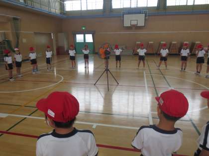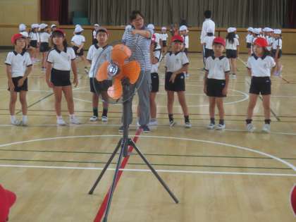 玉入れの練習です。カゴの代役で扇風機?競技開始と思っていたら、可愛くダンスをはじめ、それから玉入れです。本番をお楽しみに!