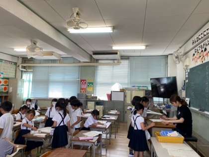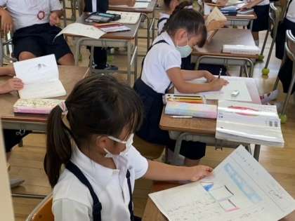 子どもたちが楽しかったことや嬉しかったことを文にして書き、色鉛筆を使って絵もかいていました。