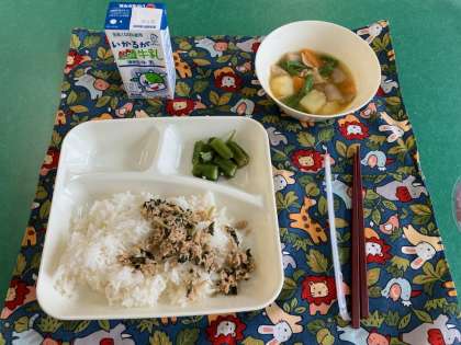 豚肉とじゃがいもの煮もの、オクラの梅風味、ツナっ葉いため、ごはん、牛乳