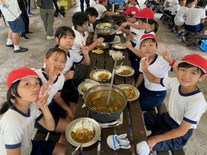 みんなで盛り付けをしたカレーを食べています。