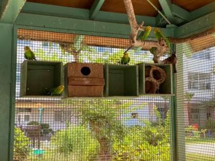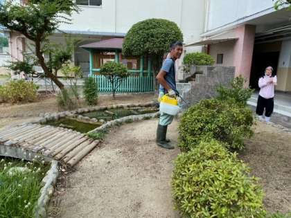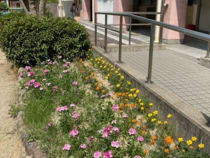 夏休み中は、日直の先生が、花の水やりや小鳥のえさやりをしています。