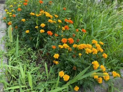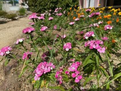 校庭の花壇に、夏の花、マリーゴールドとナデシコが咲いています。