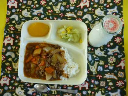 ハヤシライス、野菜サラダ、黄桃(缶)、牛乳