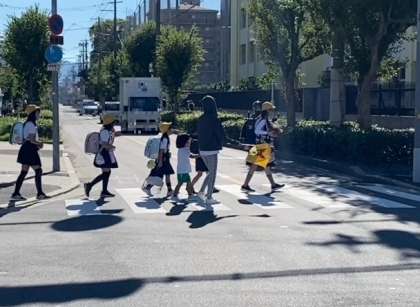 昨日に続いて、PTA役員・実行委員会の方々が、旗を持って、通学路や交差点で登下校時の見守り活動をしてくださっています。