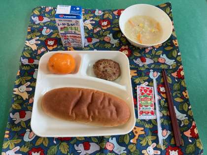 焼きハンバーグ、豆乳スープ、みかん(冷凍)、黒糖パン、牛乳