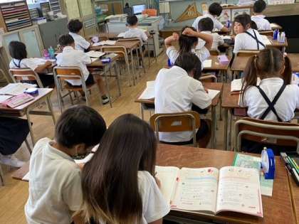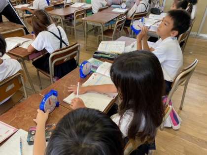 一日や午前・午後がそれぞれ何時間か、子どもたちが「時計」を使って考えています。